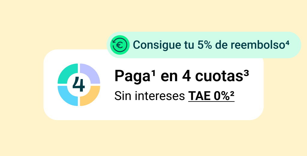 ¡Novedad! Paga en 4 cuotas con tarjeta y recibe un 5% de reembolso. Más información