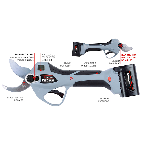 Tijera de podar eléctrica ARVIPO PS37 EVO-2 (incluye 3 baterías de 2,4 Ah) + cargador