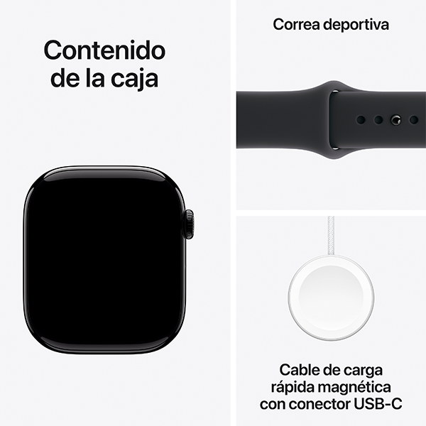 - Incluye: correa + cable de carga magnética rápida con conector USB-C para el Apple Watch (1 m)