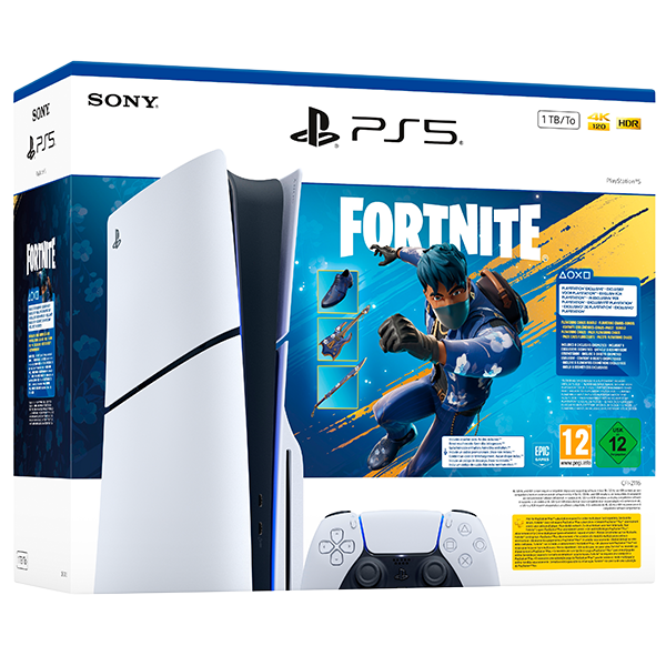 Mando inalámbrico DualSense®, SSD de 1 TB, unidad de disco3, 2 pies de soporte horizontal, cable HDMI®, cable de alimentación AC, cable USB, documentación impresa, ASTRO's PLAYROOM® (juego preinstalado), código de descarga del pack Fortnite Flowering Chaos: incluye 8 elementos cosméticos exclusivos para PlayStation y 1000 paVos.